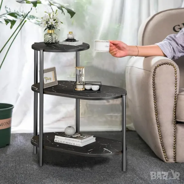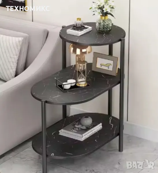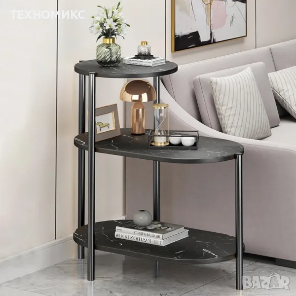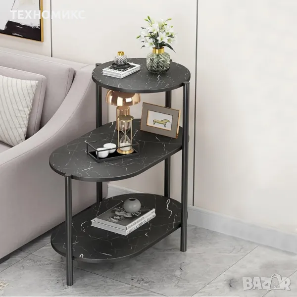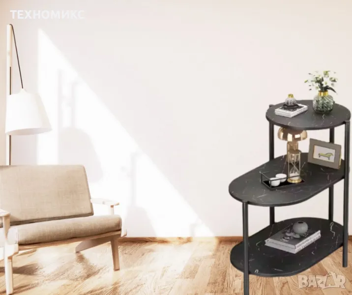 Практичен и елегантен тройностепенен рафт, изработен от здрава метална конструкция и плотове с мраморен ефект. Подходящ за организация на различни пространства – кухня, всекидневна, или офис.