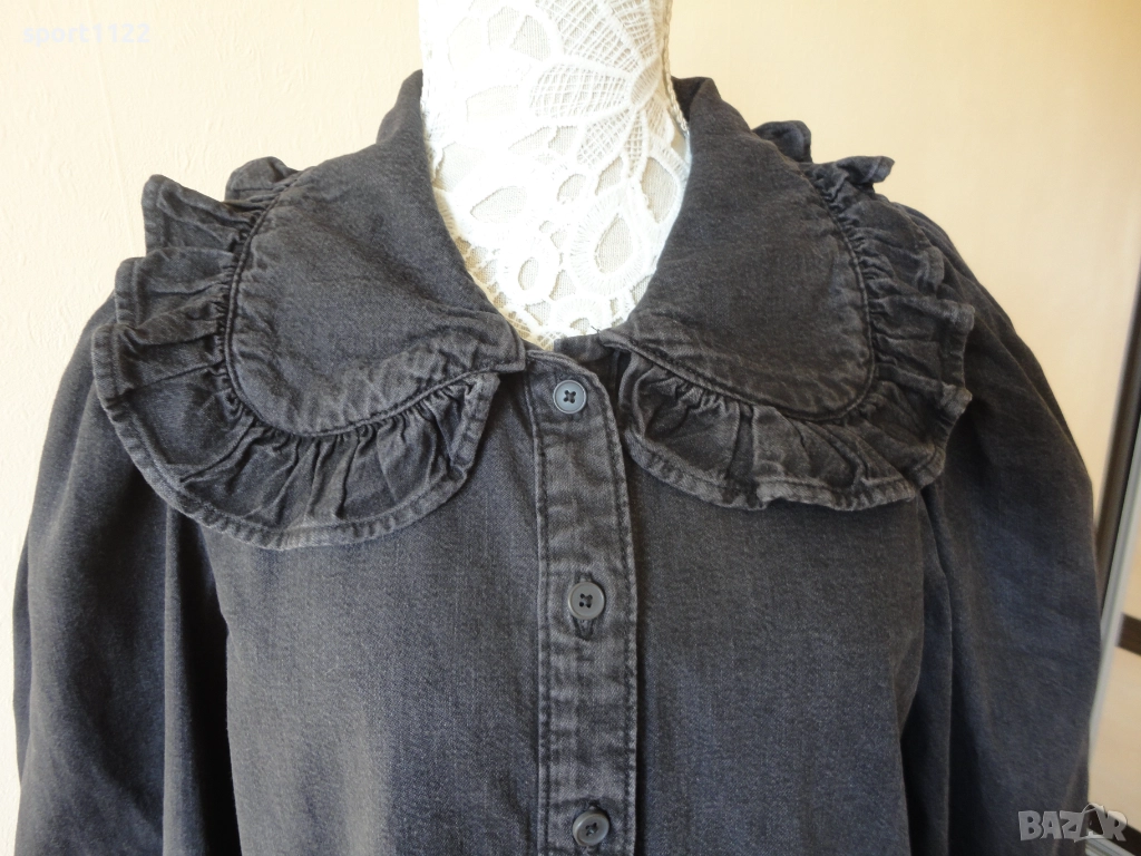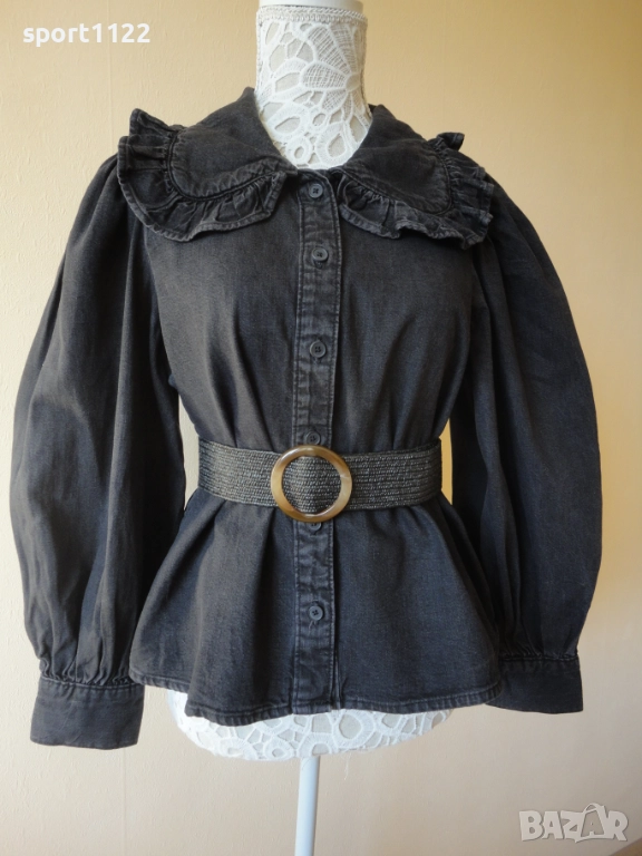 Красива дънкова блузка на Levis, в романтичен стил. Оригинална, 100% памук, цвят графит. Обличана един/два пъти, като нова. С голяма яка с волани и голям буфан ръкав. По етикет е размер S, но става и за M.