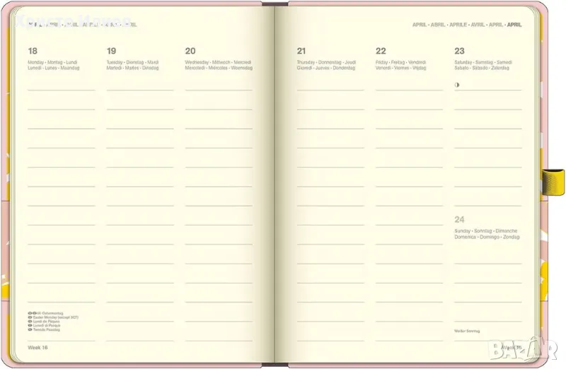 - Планерът има твърда корица, заоблени ъгли, еластично затваряне, държач за химикал, отметка и разширяем вътрешен джоб.