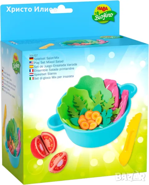 Цветна смесена салата от детска кухня HABA ви дава забавление до творчески ролеви игри с комплекта за игра салатен микс за деца от 3 години