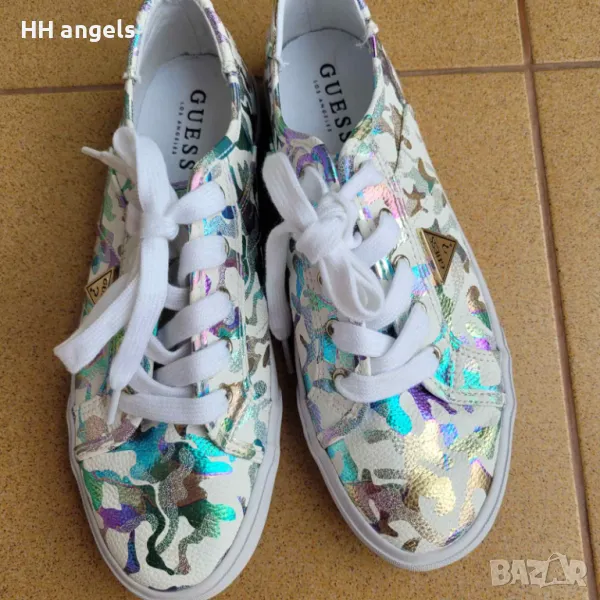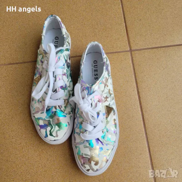 Guess нови сникърси,38 номер,UK 5,дължина на стелката 24.5 см.С отстранен етикет.Ефектен модел с изкрящи цветни елементи.