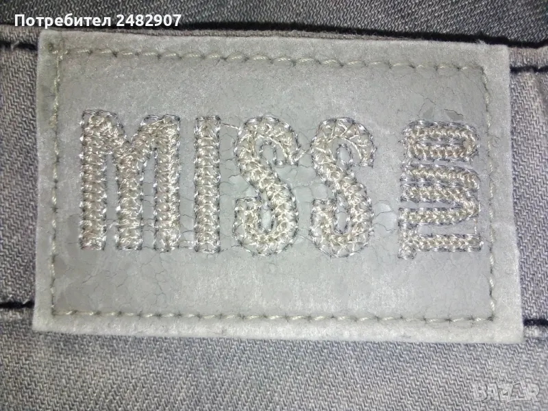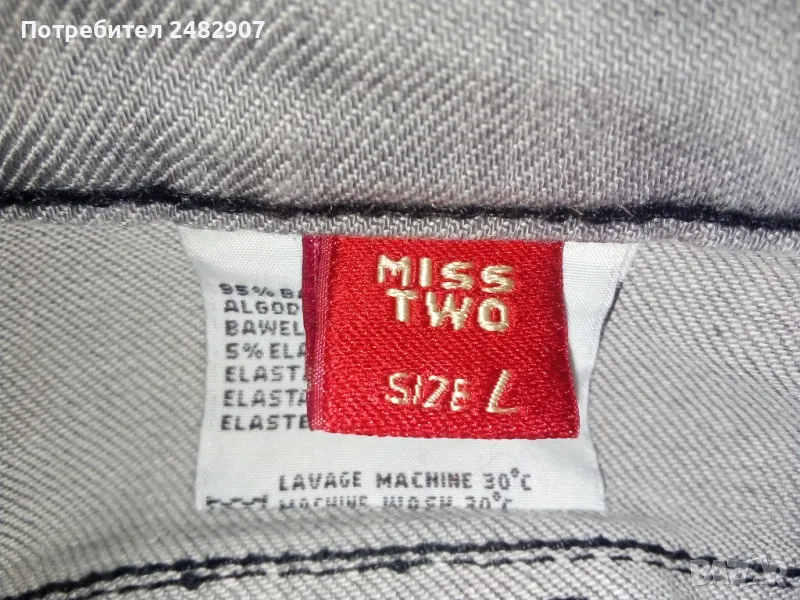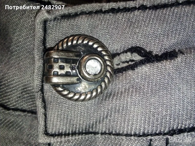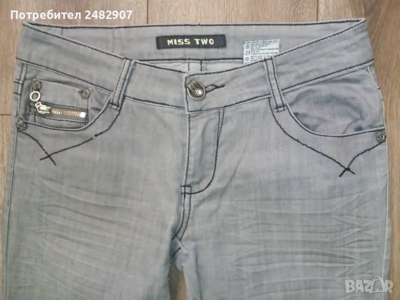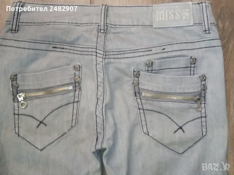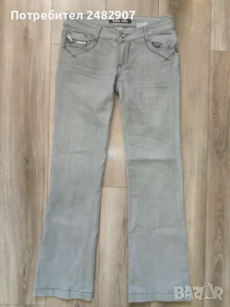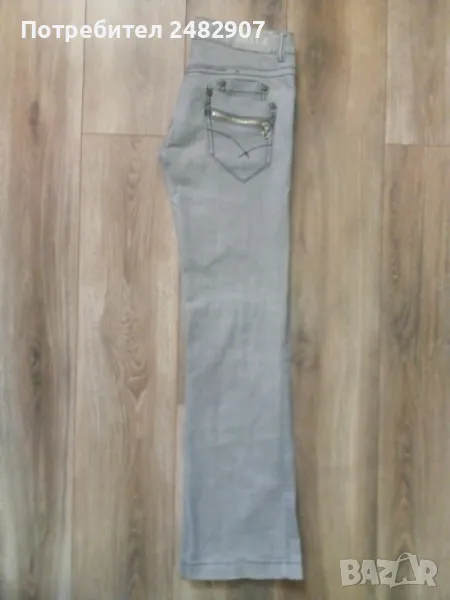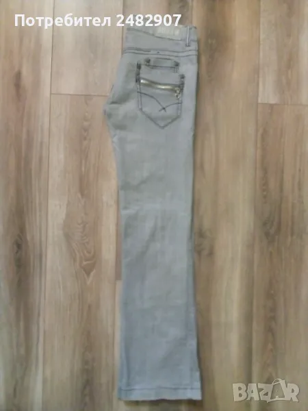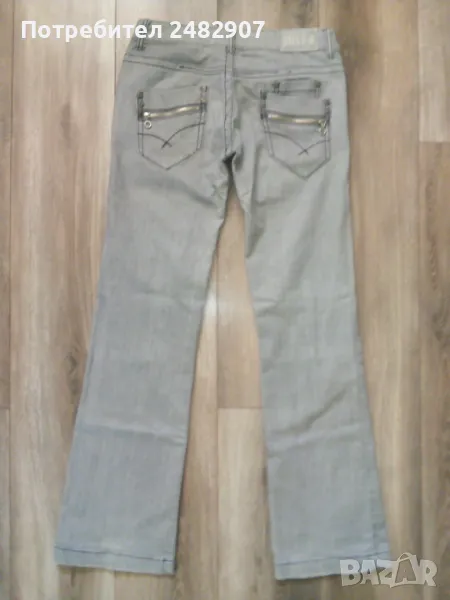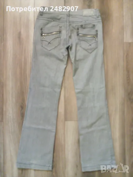 Сиви дамски дънки, размер L. Съдържат 95 % памук и 5 % еластан. Ширина в талията - 40 см, дължина от талията до чатала - 19 см, дължина от талията до долу - 102 см, ширина на крачола в долната част - 23 см. Много запазено, почти не са използвани, закопчаване - с цип и копче отпред, не са еластични.