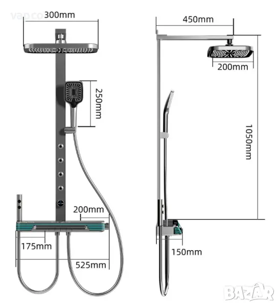 - Ръчен душ с възможност за регулиране на височината и ъгъла и три режима на работа и бутон за превключване между тях