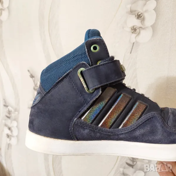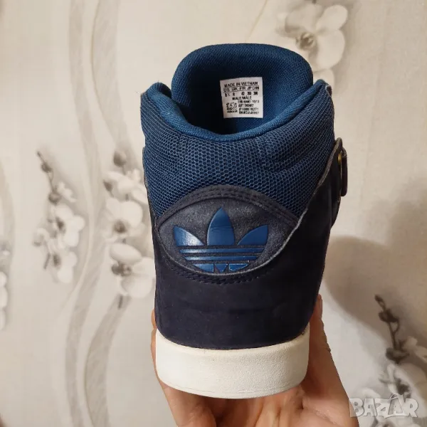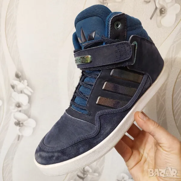 Мъжките обувки adiRise 2.0 са вдъхновени от 90-те години . Три ивици в специален цвят се открояват , фино доминиращи върху тъмносинята повърхност на обувката . Изработени са от набук и велур с характерна каишка , минаваща през глезена. Областта на глезена и езикът са изработени от високо дишаща материя , покрита с мрежа . Върхът на обувката е перфориран . Цялата обувка е допълнена от зелено -сини метални аксесоари .