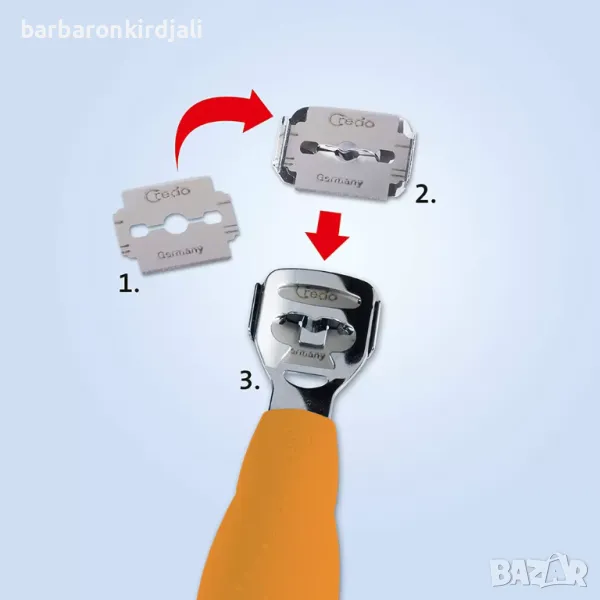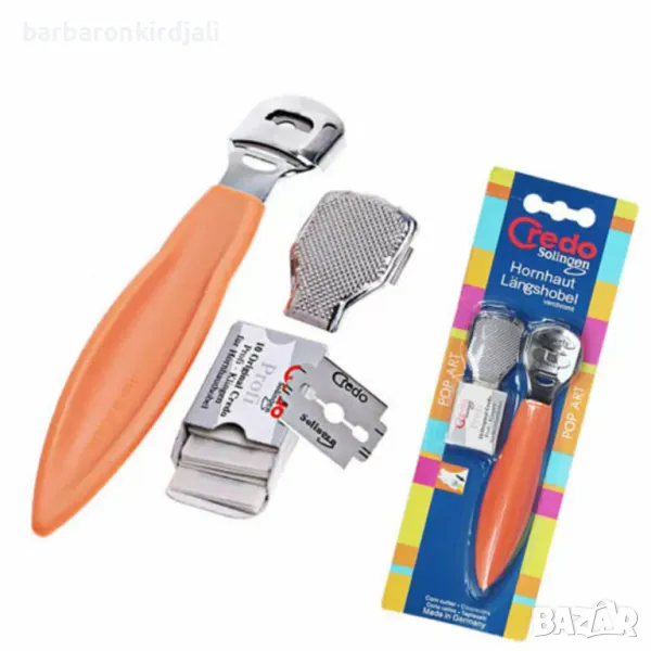 Credo Solingen Кюрета за пети е предназначена за лесно и бързо отстраняване на загрубялата кожа и мазолите, в резултат на което осигурява гладки и меки пети. Тя е изключително удобен и практичен уред, който предлага дълготрайни резултати, главата е със сменяеминожчета, а удобната и дълга дръжка позволява стабилност и контрол над действията по време на употреба. В комплекта е включена и допълнителна глава, която представлява ренде за пети, изработена от висококачествена неръждаема стомана.