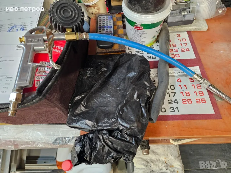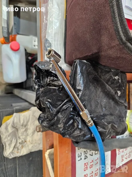 Пистолет за помпане на гуми с манометър с леко пукнато на манометъра ,но не влияе по никакъв начин на работата снимано е.Турски е пистолета и е добро качество.