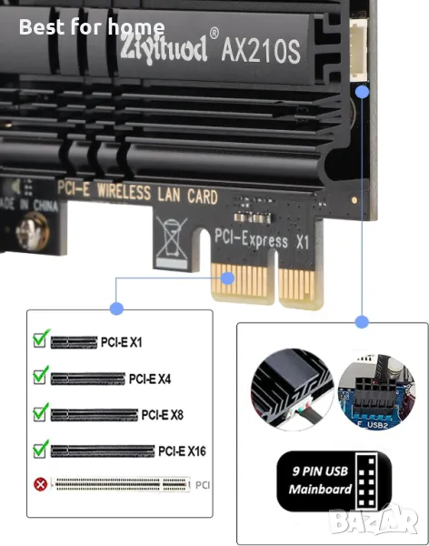 Стандартни и нископрофилни скоби - както стандартна, така и нископрофилна скоба, за стандартни и мини корпуси за компютри, са предоставени и съвместими с всички PCIe стандарти. [Изтеглете драйвера от мрежата на Intel, като потърсите „AX210“.