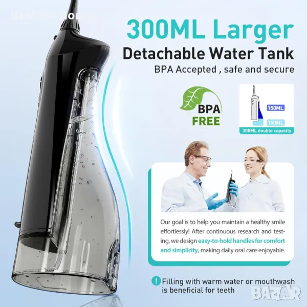 Изключително голям резервоар за вода без съдържание на BPA от 300 ml, без нужда от често зареждане: Този конец за вода разполага с подобрен резервоар за вода от 300 ml, два пъти по-голям от капацитета на други стари модели, елиминира необходимостта от чести зареждания и прави почистването на устната кухина по-удобно и ефективно