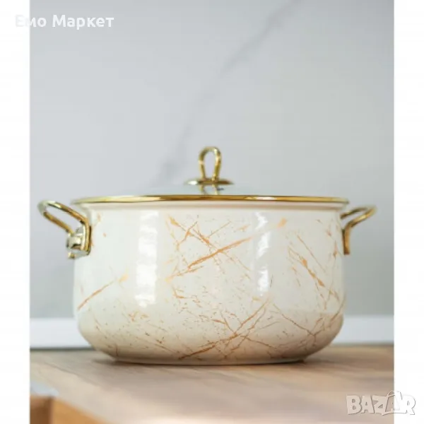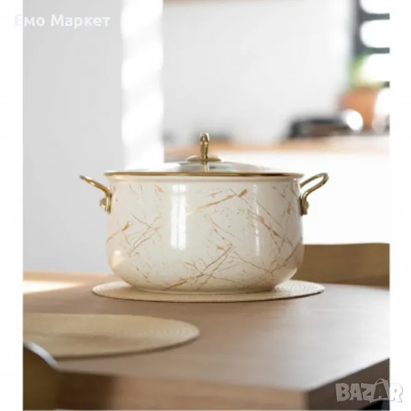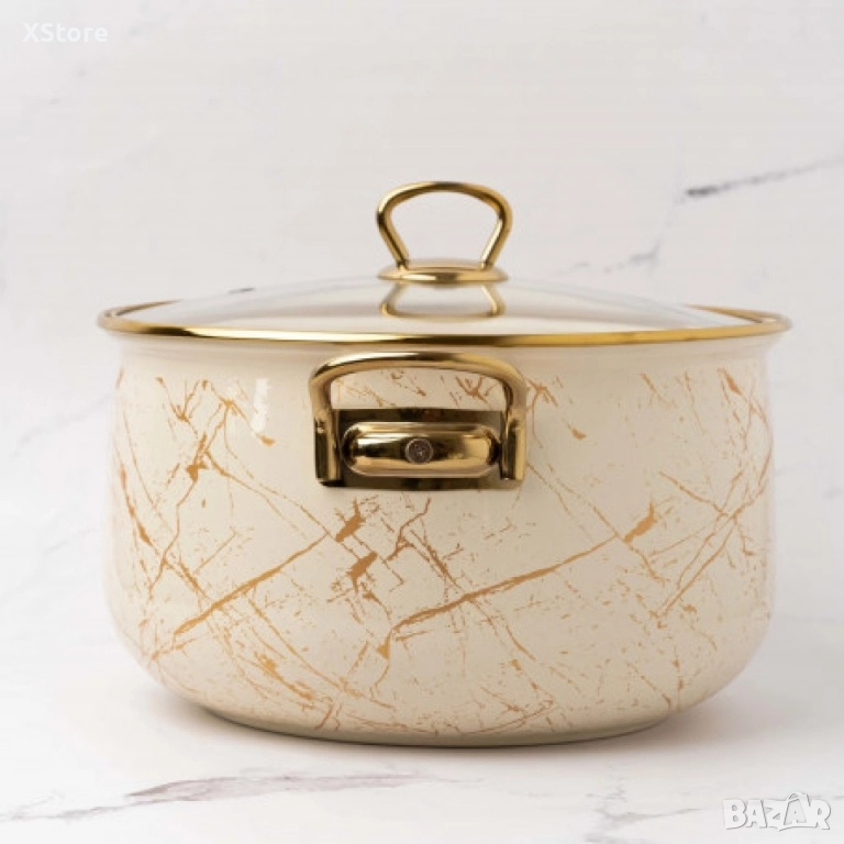 Висококачественa, издръжливa емайлиранa тенджера със стъклен капак и хромирани дръжки.