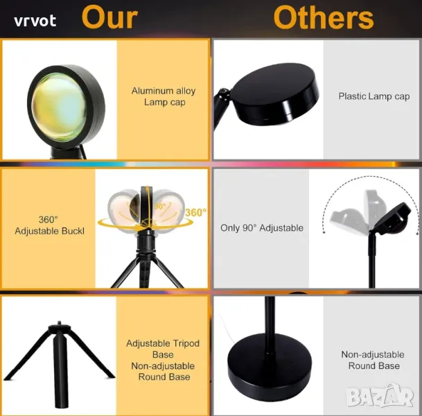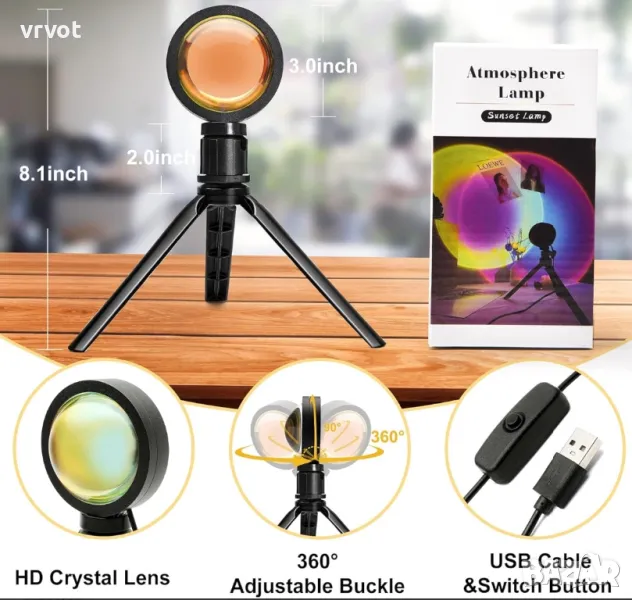 【Стабилна и издръжлива】Основата на тази лампа за залез слънце приема уникален дизайн на статив, който е стабилен и регулируем, по-функционален от кръглата основа на други.