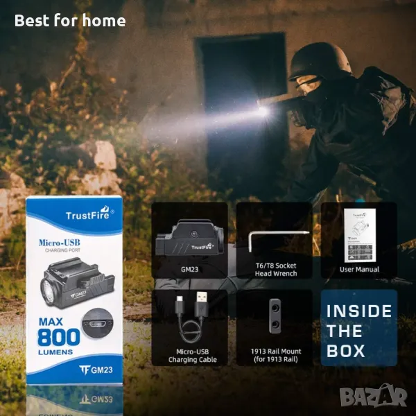 ВЪТРЕ В КУТИЯТА: Пистолетна лампа GM23 с вградена акумулаторна батерия, монтаж на релса 1913 (за релса 1913), гаечен ключ T6/T8, Micro-USB кабел за зареждане, ръководство за потребителя