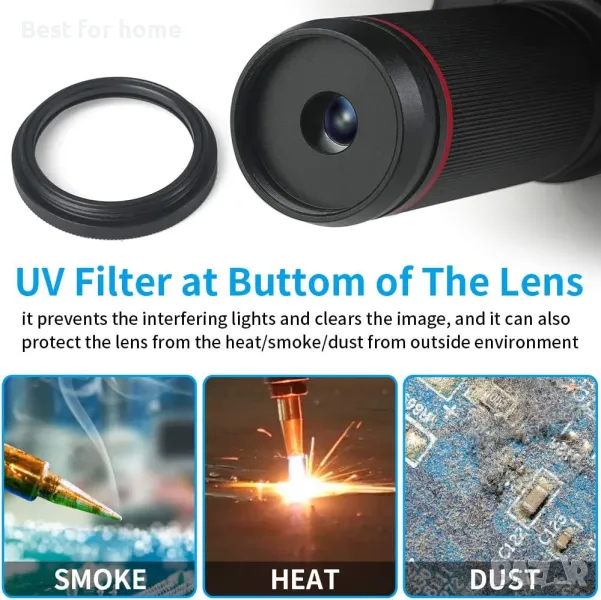 【Уникален дизайн на UV филтър】: UV филтърът е оборудван пред металната леща, за да блокира топлината от запояване, дима и праха, за да защити лещата, което е много подходящо за специалисти по запояване и поддръжка