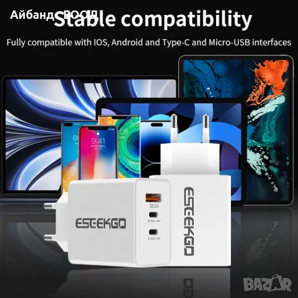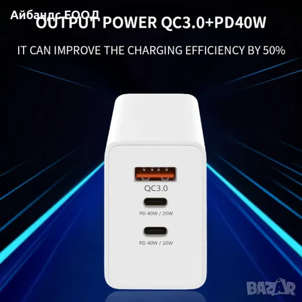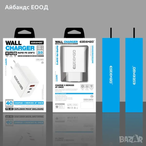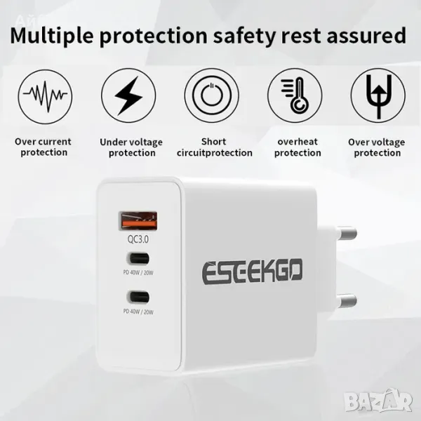 3-в-1 Бързо Зарядно Адаптер: USB Type A и Двоен USB Type C (40W/20W)