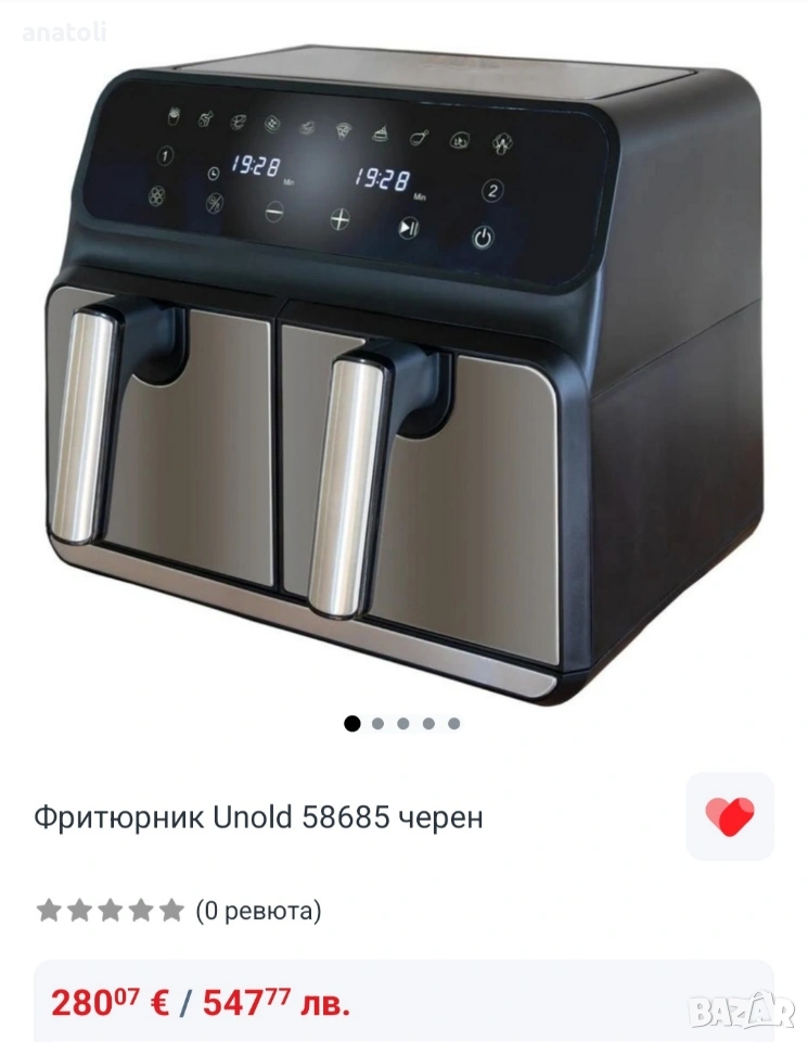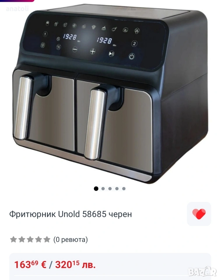 чисто нови от Германия Фритюрник Unold 58685 черенФритюрникът Unold 58685 е идеално устройство за тези, които търсят удобен и здравословен начин за готвене. Марката Unold, известна с висококачествените си продукти, отново впечатлява с красив и функционален продукт. Дизайнът без мазнина ви позволява да готвите вкусни и хрупкави пържени картофи без да използвате масло, като същевременно намалявате броя на калориите в храната.С капацитет от 8 литра (2 х 4 литра), фритюрникът Unold ви позволява да готвите две ястия едновременно, което е не само удобно за семейства, но и спестява време. Контролът на температурата и таймерът ви позволяват да регулирате параметрите според вида и броя на ястията. Освен това фритюрникът е снабден с нехлъзгащи се крачета и сензорен контролен панел за максимално лесно използване. Купата с незалепващо покритие и незагряващи дръжки гарантира лесно и безопасно почистване на уреда. А благодарение на пластмасовия корпус, фритюрникът е много лек и лесен за транспортиране.Фритюрник Unold 58685 разполага с до 10 програми, което го прави не само отличен избор за любителите на пържени картофи, но и за хората, които ценят разнообразието в кухнята. Електронното управление и LCD дисплеят правят използването на устройството интуитивно. А благодарение на защити като автоматично изключване и защита срещу прегряване, можете да сте сигурни, че храната ви ще бъде приготвена безопасно и точно според вашите предпочитания.Фритюрникът Unold 58685 е не само технологично решение, но и красив декоративен елемент в кухнята в черно, което ще привлече вниманието на всеки любител на модерния дизайн.Технически спецификации:Марка: UnoldПроизводител: UnoldГаранция: 2 години за външен сервизТип: без мазниниМощност: 1700WКапацитет на купа/кошница: 8 L (2 x 4 L)Функции: възможност за готвене на две ястия едновременно, контрол на температурата, таймерКонструкция: неплъзгащи се крачета, сензорен контролен панел, незалепваща купа, ненагряващи се дръжки, пластмасов корпусБрой програми: 10Управление: електронноКомуникация: LCD екранЗащита: автоматично изключване, защита от прегряванеРазмери: 37,7 х 36,2 х 32 смТегло нето: 8 кгЦвят черен