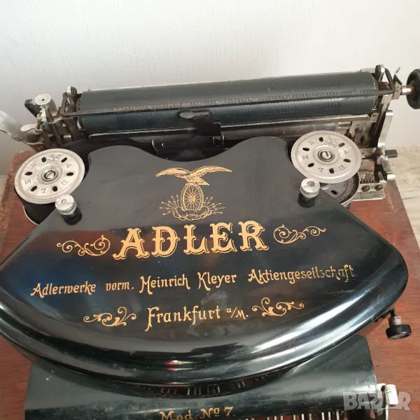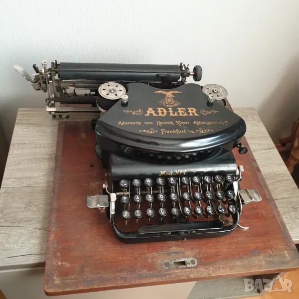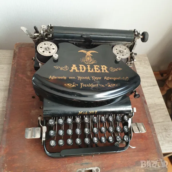 Първата масово произведена пишеща машина в Германия Първият модел на марката Adler Механизъм за преден удар с натискане 3 редова клавиатура.Можете да поставите хартия и да започнете да пишете. Компанията Adler за първи път започва да произвежда пишещи машини, велосипеди и моторни превозни средства в Германия в края на 19 век. Първата пишеща машина на компанията е представена през 1898 г. Тази машина има механизъм с тласкач, в който прътите на пишещата машина са разположени хоризонтално. Когато потребителят натисне клавиш, машината избутва пръчката на пишещата машина напред. Това е била значително различен дизайн от другите пишещи машини по онова време, които са използвали предимно движение нагоре или надолу.