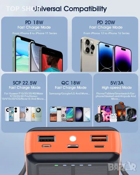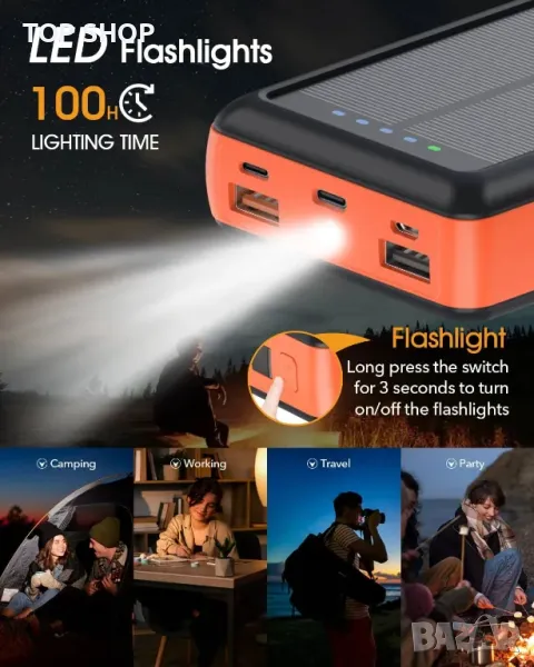 Тази компактна захранваща банка разполага със значителен капацитет от 20 000 mAh, което позволява многократно зареждане на устройството. С размери само 14,5 x 7,2 x 2,9 см и тегло 455 гр, той е изключително преносим и се побира удобно в дланта или джоба ви. Той включва вградени Type-C и iOS изходни кабели, елиминирайки необходимостта от допълнителни кабели. С Type-C порт, поддържащ PD20W бързо зареждане и USB-A порт за 22,5W QC3.0 изход, той зарежда устройствата бързо. Това универсално зарядно устройство може да захранва до пет устройства едновременно чрез множеството си портове, което го прави идеално за споделяне. Освен това интегрираните LED светлини подобряват неговата полезност за дейности на открито.