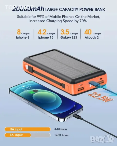 Соларна външна батерия, 20000mAh преносимо зарядно, вградени 2 кабела