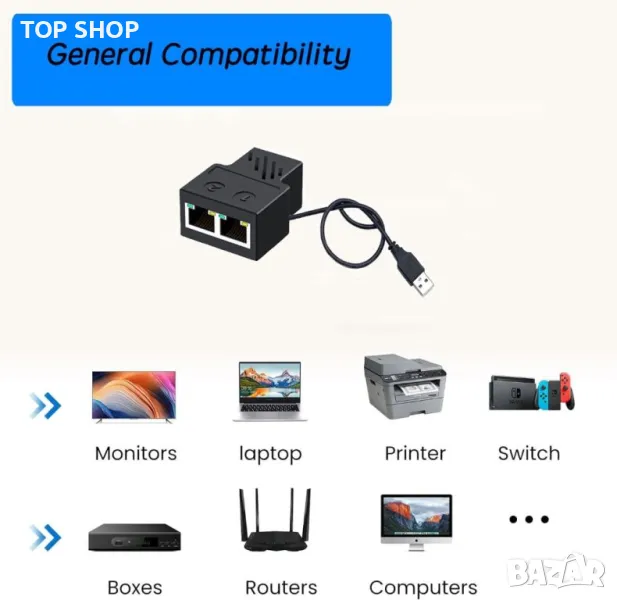 Ethernet сплитерът Wuedozue RJ45 ефективно разделя един Ethernet кабел на два изхода, поддържайки едновременен достъп до интернет за два компютъра със скорост до 100Mbps на изход. Той разполага с общ капацитет на честотната лента от 1000Mbps и осигурява предаване на сигнал без смущения. Съвместим със стандартите Cat 5, Cat 5e, Cat 6 и Cat 7, този сплитер е изработен от издръжлив PVC и разполага с дебела дънна платка с печатна платка, с метална екранировка за предотвратяване на електромагнитни смущения. Включва 1,2-метров USB захранващ кабел и има компактни размери от 4 cm x 3,5 cm x 2,1 cm.