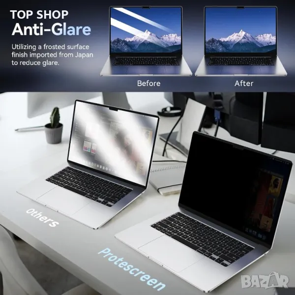 Моля използвайте системата за съобщения! Просто изпратете запитване. По телефона се губи време за уточняването на търсения от Вас продукт.Този екранен филтър за поверителност на MacBook е съвместим с MacBook Pro 13 инча (от 2022 до 2016 г., M1/M2 чип) и MacBook Air 13 инча (от 2021 до 2018 г., M1 чип). Той предлага отлична защита на поверителността с тесен ъгъл на гледане и вграден плъзгащ се капак на камерата за допълнителна сигурност. Освен това, той функционира като протектор за очите с филтър против отблясъци на синя светлина, блокиращ 68% от синята светлина и 99,9% от UV лъчите. Инсталацията е лесна и за многократна употреба, като се закрепва магнитно без необходимост от лепила. Екранът за поверителност поддържа режим на заспиване, като остава прикрепен с минимални празнини, когато вашият MacBook е затворен.