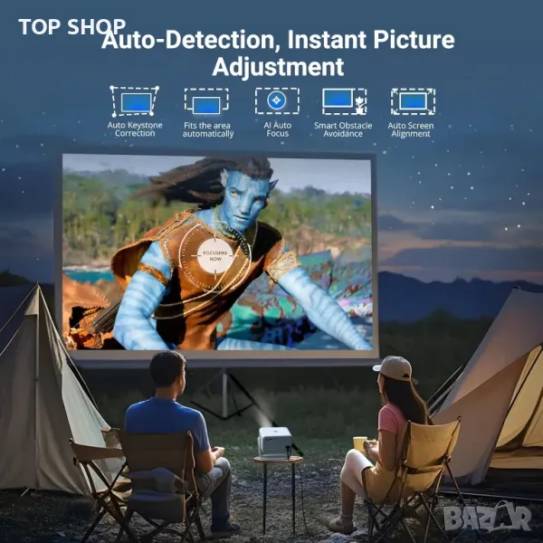 Този преносим 4K проектор поддържа пълна HD 1080P разделителна способност с яркост 300 ANSI и контрастно съотношение 2000:1 за живи, резки изображения. Неговото съотношение на фокусиране 1,16:1 позволява проекция на голям екран в малки пространства, докато автофокусът и автоматичната корекция гарантират перфектно подравнено изображение. Сертифициран за Netflix, той осигурява стабилно поточно предаване без прекъсване с интелигентно избягване на препятствия и автоматично регулиране на екрана за безпроблемна употреба. Три режима на яркост се грижат за различни условия на осветление, като същевременно намаляват синята светлина за комфорт на очите. Интегрирането на Google Assistant позволява гласово управление със свободни ръце, а стойка, въртяща се на 180°, предлага гъвкави ъгли на гледане, което я прави идеална за домашно кино или спални.