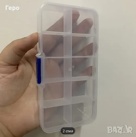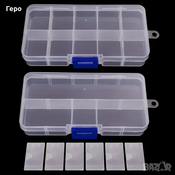 Нов, универсален органайзер за риболовни и други принадлежности с 10 отделения. Прозрачен, издръжлив PЕ материал. Сваляеми разделители. Перфектен за съхранение на примамки, кукички и др. аксесоари. Размери 12.8 / 6.5 / 2.2 см. Изпращам с преглед, лично предаване.