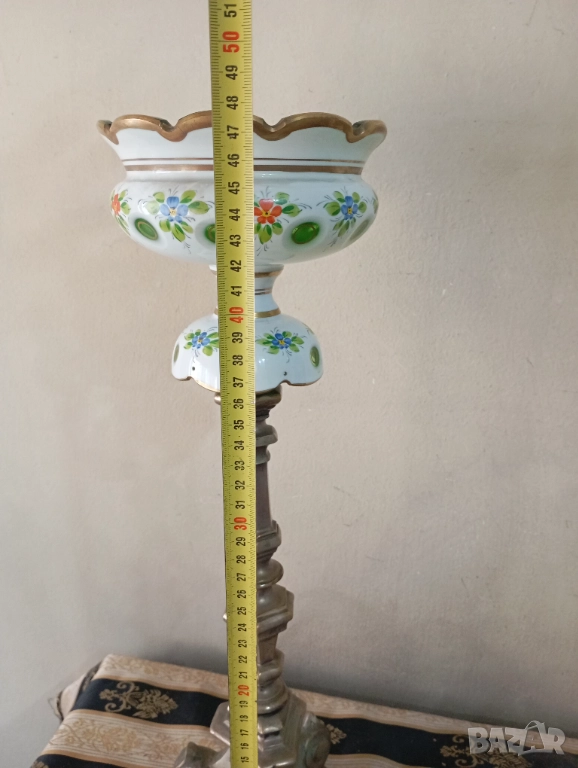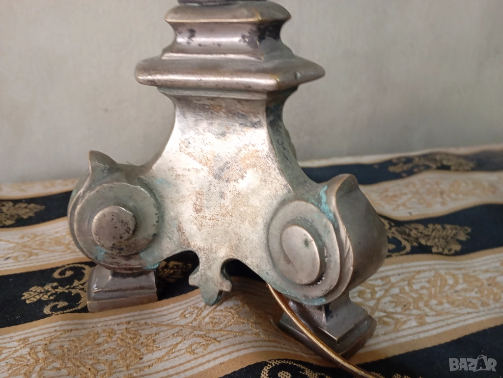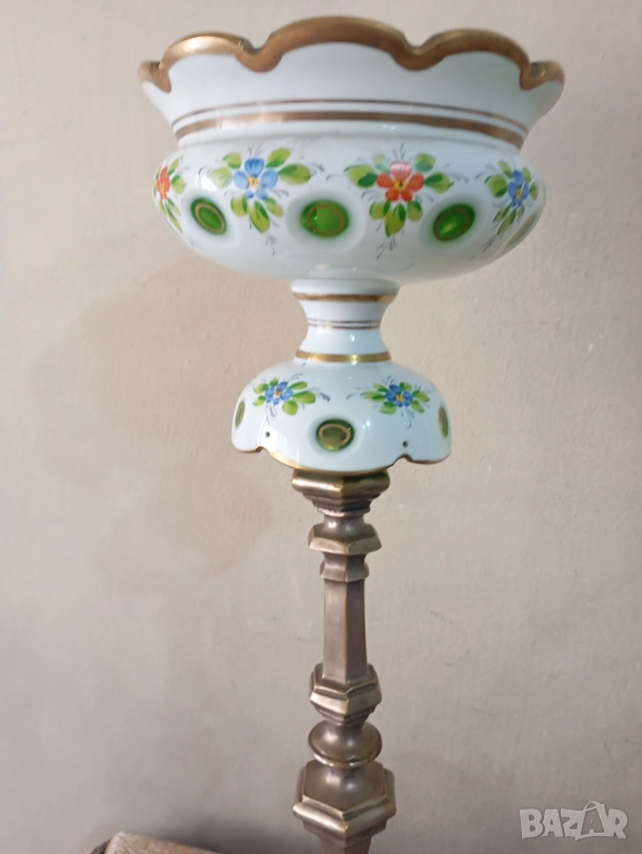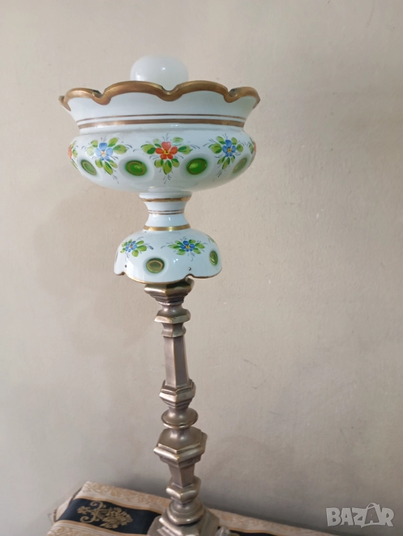 Посребрен масивен месингов корпус (изтърквания на покритието).Абажур от стъкло Бохемия,ръчно гравирано.
