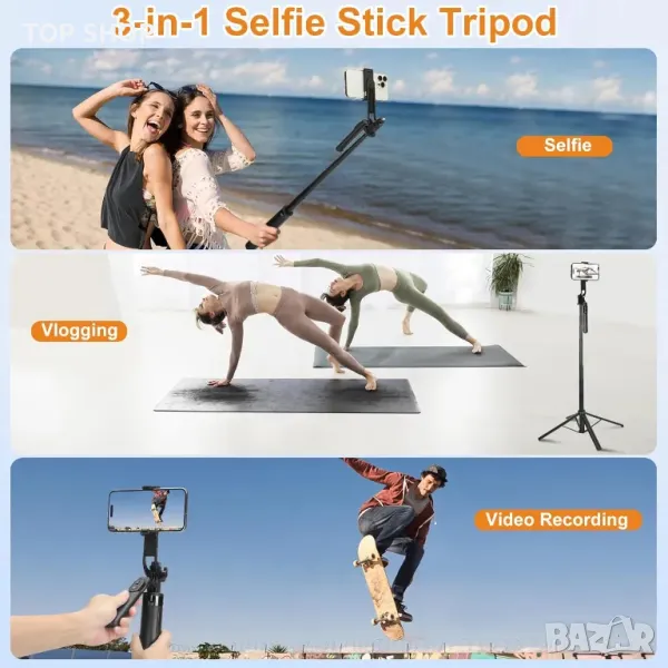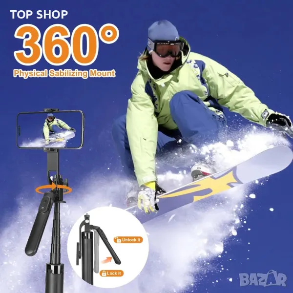 Този многофункционален статив разполага с 360° панорамно заснемане и 270° вертикална настройка, позволяваща оптимални ъгли както в хоризонтални, така и във вертикални формати. Той включва подвижен, презареждаем безжичен дистанционен затвор с обхват до 10 метра, което улеснява заснемането на селфита или пейзажи. Проектиран за съвместимост с различни устройства, той служи както като селфи стик, така и като статив, като побира смартфони, леки камери и GoPro HERO12 без допълнителни адаптери. С регулируема дължина от 32 до 178 см и компактен дизайн, той е перфектен за пътуване, онлайн обучение, уроци по гримиране и други, осигурявайки създаване на съдържание със свободни ръце.