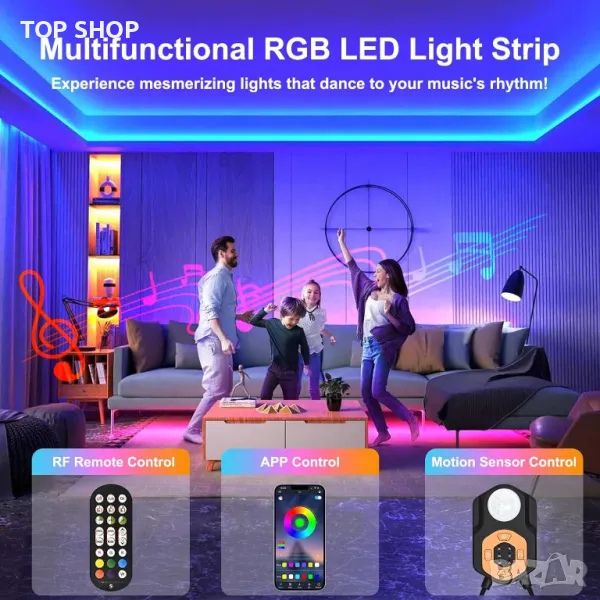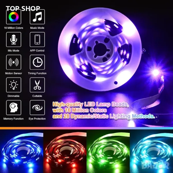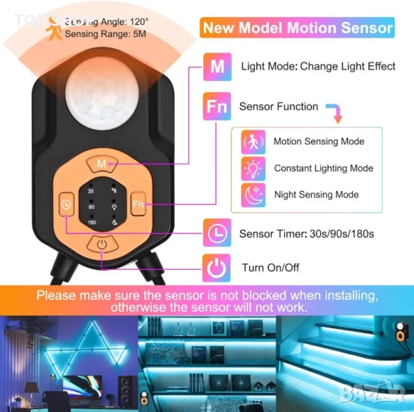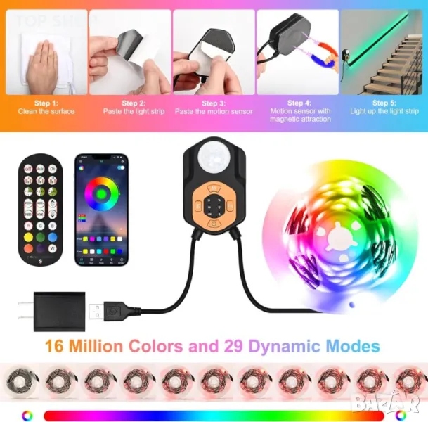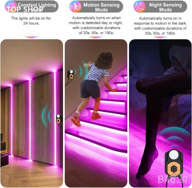 Моля използвайте системата за съобщения! Просто изпратете запитване. По телефона се губи време за уточняването на търсения от Вас продукт.Светодиодната лента със сензор за движение предлага три интелигентни режима на отчитане: отчитане на движение, постоянно осветление и нощно отчитане за адаптивно осветление. Можете да го управлявате чрез сензор за движение, дистанционно управление или Bluetooth приложение, което позволява автоматична или ръчна работа и дори синхронизиране на музика. Функцията за памет запазва вашите предпочитани настройки. Отличаващ се с LED перли с висока яркост, тя осигурява живо осветление с 16 милиона цвята и 29 режима на осветяване. Лесна за инсталиране със залепваща подложка, тази универсална LED лентова лампа е подходяща за различни пространства, от спални до стаи за игри, подобрявайки вашата среда без усилие.