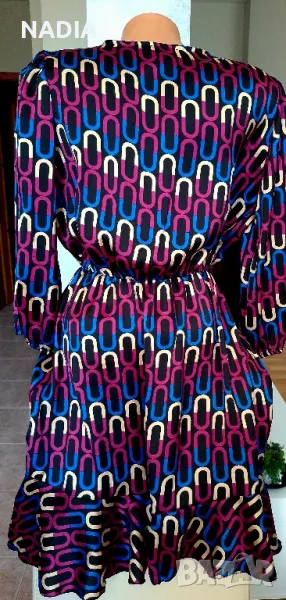 Рокля от сатенирана материя без лъскавина. Дължина 91, от рамо до рамо 38, талия на ластик и се разтяга до 50см, ханш 60см.