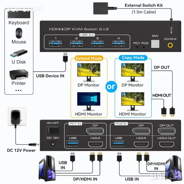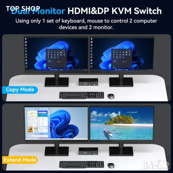 Моля използвайте системата за съобщения! Просто изпратете запитване. По телефона се губи време за уточняването на търсения от Вас продукт.KVM превключвателят с поддръжка за два монитора (DP+HDMI) ви позволява да свържете два компютърни хоста и да споделяте един комплект клавиатура и мишка с два монитора. Той предлага разширен режим или режим на дублиране за компютърни хостове, осигурявайки гъвкавост за различни настройки на дисплея. KVM превключвателят поддържа дисплеи с висока разделителна способност до 8K60Hz и 4K120Hz, с USB 3.0 портове за бърз трансфер на данни. Можете да превключвате между компютри с помощта на бутон за кабелно разширение или бутон с едно докосване, което го прави удобно и ефективно. Моля, обърнете внимание, че графичната карта на компютъра ви трябва да поддържа два или няколко монитора за пълна функционалност.