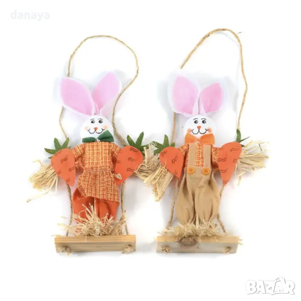Добавете игриво настроение към празничния си декор с тази великденска висяща украса! Очарователното зайче на люлка с два моркова ще внесе свежест и радост във всяко пространство.