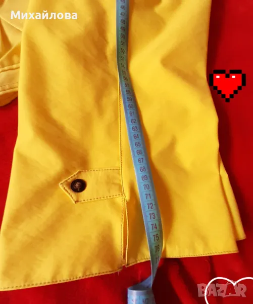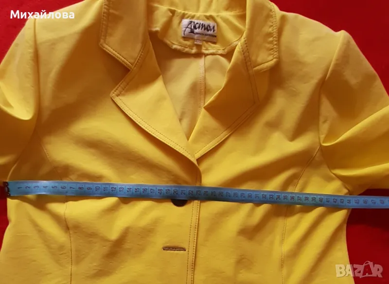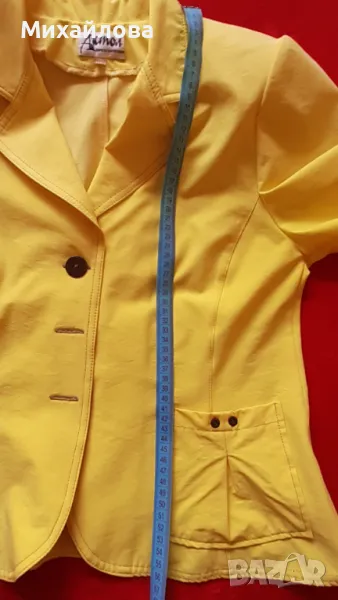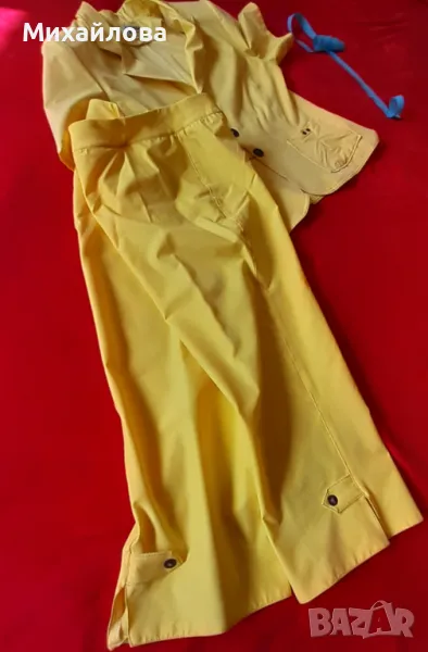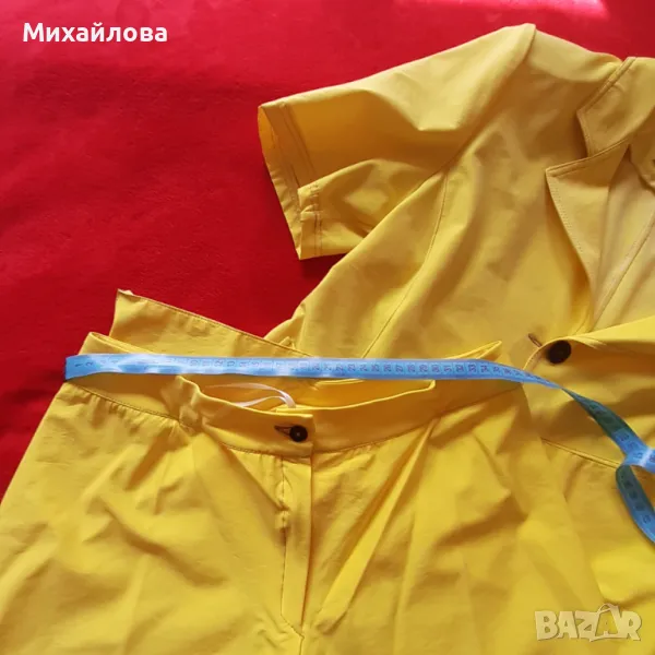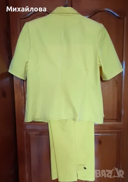 Спортно елегантен костюм сако и 7/8 панталон. Актуален ярко жълт цвят с красиви копчета. Цвета най - точно се вижда на снимката със сърце (показана е дължината на панталона). Лека и приятна материя. Много запазен. Размер 44, произведено в България. Повече размери на снимките.
