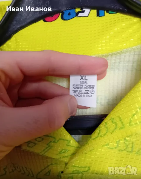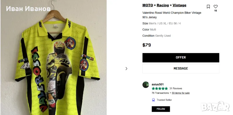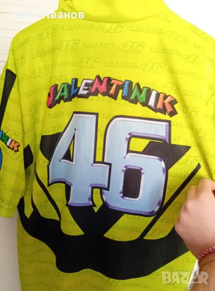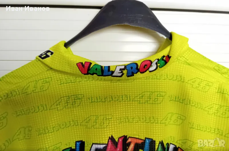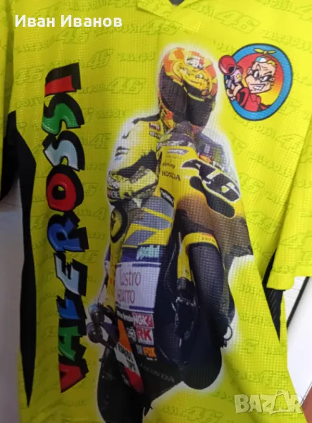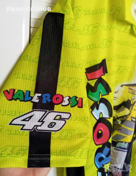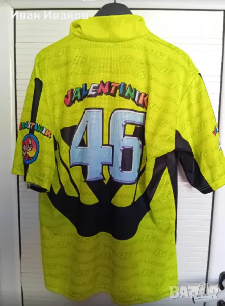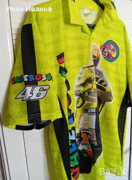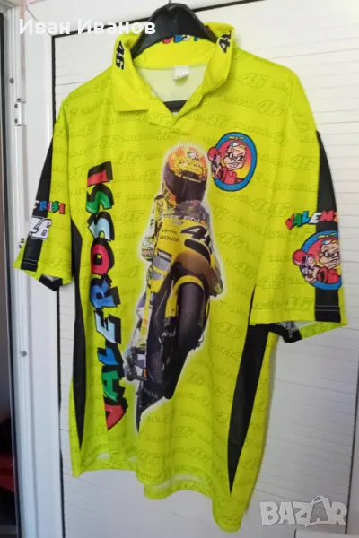 Уникална тениска на великия Валентино Роси в перфектно състояние. Всички етикети са налични. Произведена е в Италия(откъде е и купена през 1999г., когато Роси взе титлата на Гранд При). Тениската е в перфектно състояние, не е обличана, само е съхранявана. Размер ХЛ.