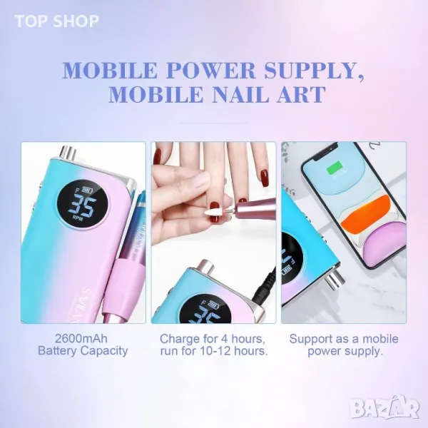 Комплектът електрическа пила за нокти Saviland е предназначен както за професионална, така и за домашна употреба, включващ мощен мотор с регулируеми скорости до 40 000 RPM за ефективно справяне с различни задачи за маникюр, включително премахване на гел, акрил и прахообразно премахване на нокти. Предлага се снабден с 11 метални накрайника, 1 керамичен накрайник и 56 шлифовъчни ленти, подходящи за премахване на кожички, мъртва кожа и мазоли. Тази пила е изработена от висококачествени материали с поразителен градиентен розов и син дизайн, предлагащ нисък шум, вибрации и топлина за комфортно потребителско изживяване. Освен това е преносим, с акумулаторна батерия от 2600 mAh, която осигурява 10-12 часа работа и поддържа зареждане тип C. LCD екранът показва настройките и състоянието на захранването, подобрявайки лекотата на използване с просто копче за управление и бутони за незабавна пауза и регулиране на посоката.