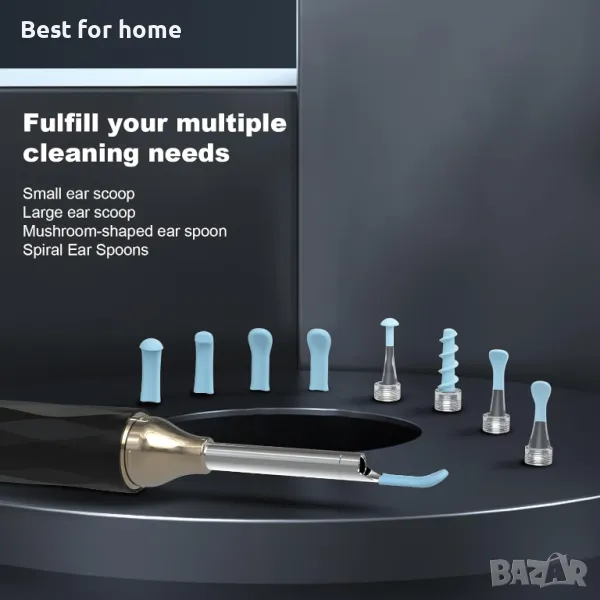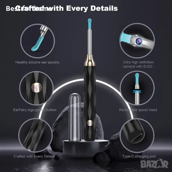 【Комплект за премахване на ушна кал Ear Pick】: Уредът за почистване на уши се доставя със стандартен комплект инструменти от 8 части за премахване на ушна кал, 8 сменяеми лопатки за уши, кутия за съхранение на накрайници за уши, камера за уши, кабел за зареждане и книжка с инструкции.