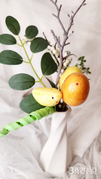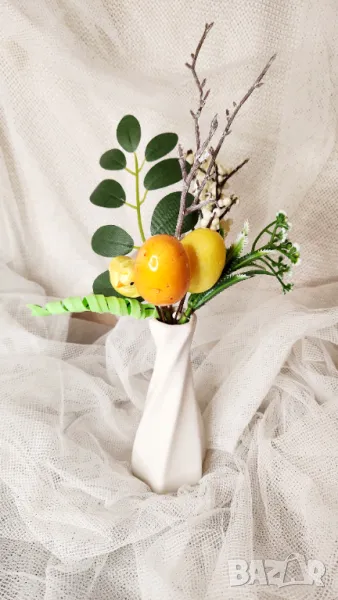 2. Композиция от изкуствени цветя и яйца за Великден, фиксирана в керамична ваза, височина 18 см, дъно на ваза 4,5 см - цена 15 лв