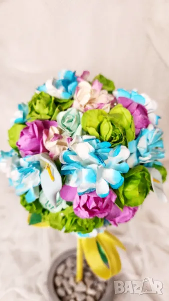 1. Декоративно дървчето от хартиени цветя, фиксирано в саксия в гипс, височина 28 см, диаметър 14 см - цена 30 лв