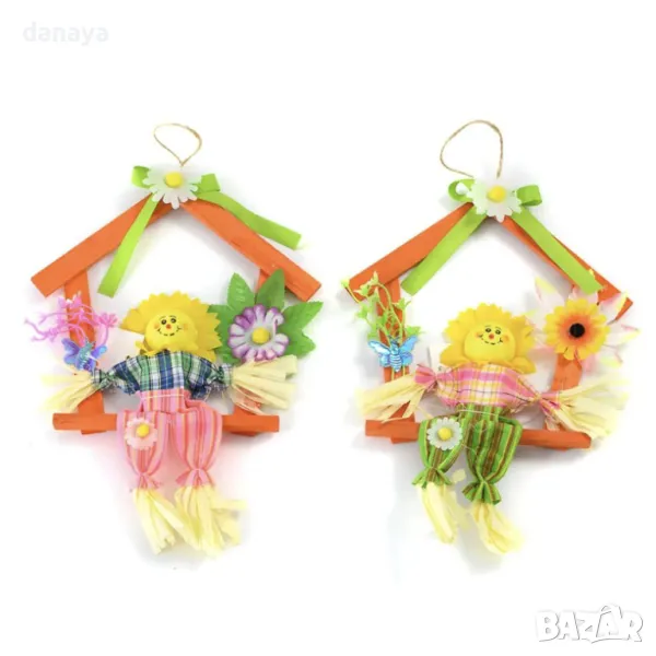 Тази очарователна Великденска украса ще донесе пролетно настроение и уют във вашия дом! Слънчогледът, седнал на люлка с форма на къщичка, е перфектен начин да добавите свежест и весела атмосфера към всяка стая. Височината на украшението е 22 см, което го прави идеално за окачване на стена, врата или прозорец