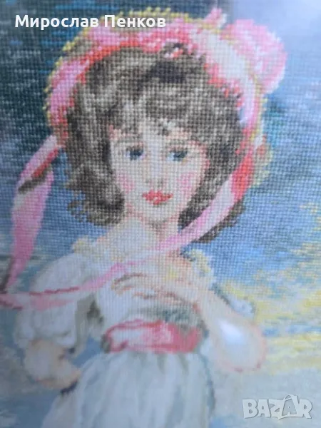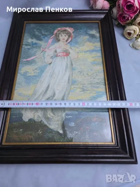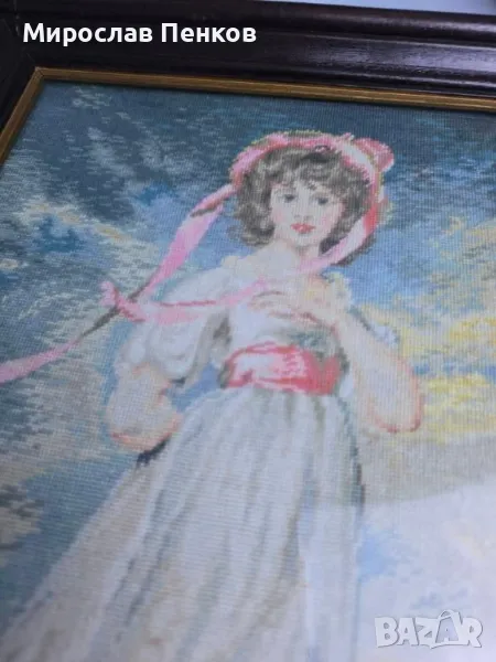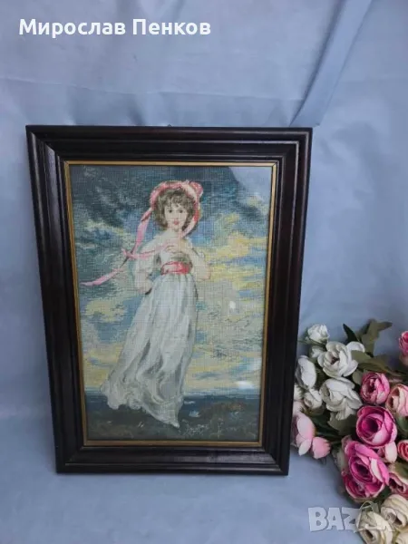 Голям рамкиран гоблен Дамата с воала-Пинки.Рамката е от масивно дърво.Размери в снимките