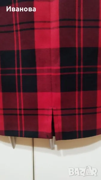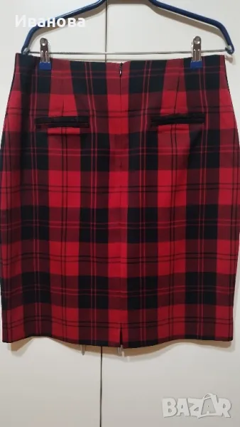 Елегантна права пола на червено - черно каре .Размер М .Материята е памук и еластан.Отзад е с цип и малка цепка , също и имитация на джобове. Черна подплата.Размери : талия 82 см ,ханш 109 см,дължина 57 см.