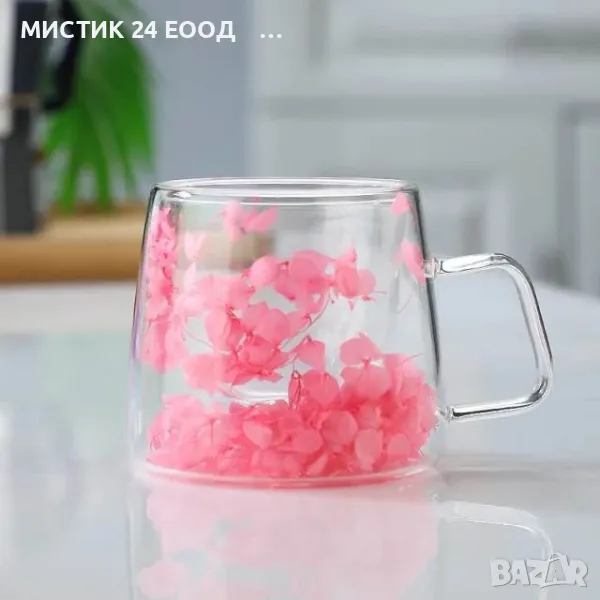 Стъклена Термо Чаша с Двойно Дъно и Вградени Естествени Сухи Цветя → Обява 49425701