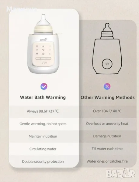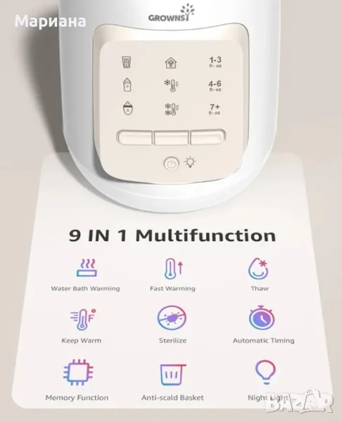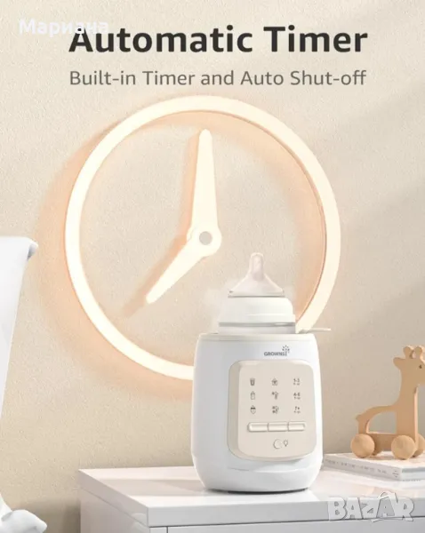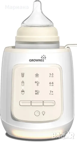 GROWNSY Bottle Warmer, 9-in-1 Water Bath Nutri Baby Bottle Warmer, Бърз и лесен нагревател за мляко за кърма и адаптирано мляко, затопля бебешкото мляко до телесна температура и поддържа хранителни веществаПостепенният и равномерен процес на нагряване на този нагревател за мляко на водна баня гарантира, че кърмата или адаптираното мляко на вашето бебе запазва своята хранителна стойност и качество и винаги остава на идеалната температура за хранене на бебето. Кажете сбогом на загубата на хранителни вещества от прегряване или микровълново нагряване.Затопляне на водна баня / Бързо затопляне / Размразяване / Поддържане на топлина / Стерилизиране / Автоматично определяне на времето / Функция за памет / Кошница против изгаряне / Нощна лампа. Спестете пари от други безполезни обемисти устройства. Тази универсална машина отговаря на всички ваши нужди120ml мляко отнема само 4 минути, за да достигне 98,6°F/37°C, поддържа млякото при постоянна температура от 98,6°F/37°C (което е идеалната температура за хранене на вашето бебе). Този универсален нагревател пасва на всички шишета за хранене, загрява достатъчно бързо, за да успокои плачещо бебе посред нощ.Лесен за използване с 3 стъпки, няма нужда да настройвате времето ръчно, автоматично определя оптималното време за затопляне въз основа на избраните от вас настройки, никога не се тревожете за прегряване, в допълнение, настройка за автоматично изключване, за да го направи по-безопасно за заети майки.【Изборът на милиони майки】:на Нагревателят за бутилки Grownsy е избран от над 9 000 000 родители. С мисията да се грижим и подхранваме всяка стъпка на растеж, ние ще продължим да подкрепяме повече семейства. Нови цена 40 лв