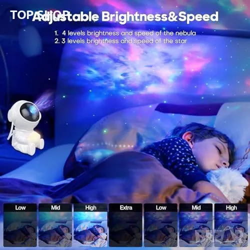 Астронавтен дизайн с гъвкави настройки: 21 режима на работа, регулируема яркост, различни цветови комбинации.