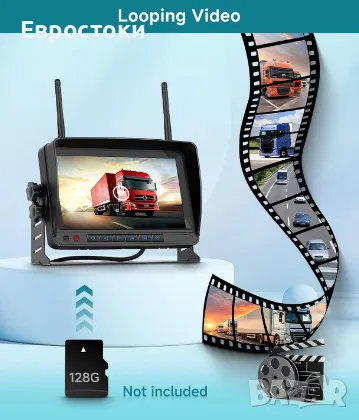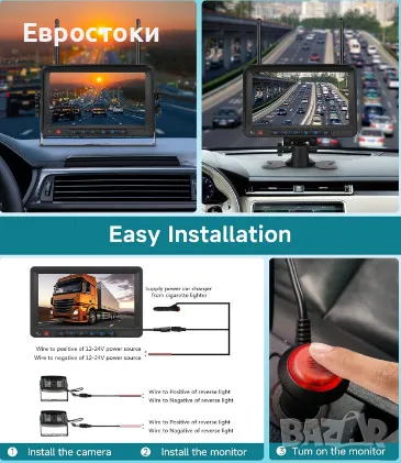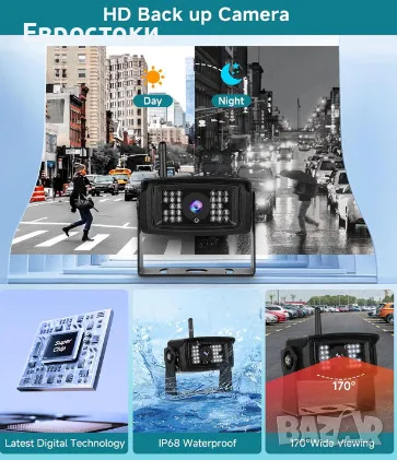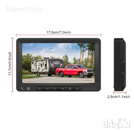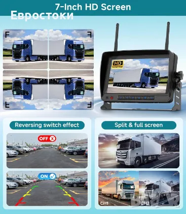 Безжична камера за задно виждане AHD с монитор 7 инча. Безжична връзка за предаване. 7-инчовият монитор е оптималният размер за много модели на автомобили - не заема твърде много място и може да представи добре съдържанието на екрана. Разстоянието на радиосигнала е до 50 м/164 фута на открито и е подходящо за много превозни средства с различна дължина.
