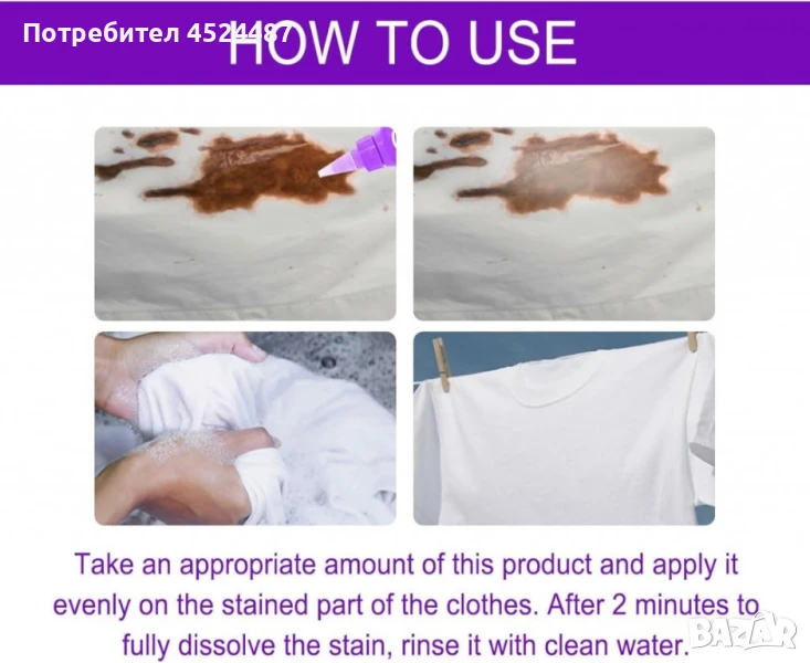 Препоръчителен начин на употреба: Нанесете препарата директно върху петната и след това изперете дрехите на ръка или в пералнята, за да видите резултатите веднага.;