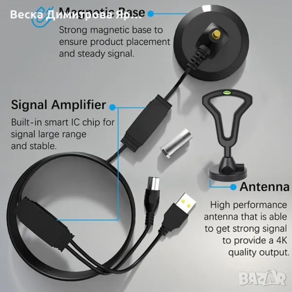 Цифрова антена HDTV с усилвател и магнитна основа, 36 DBI → Обява 49432153