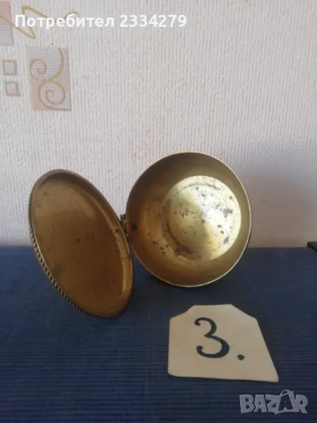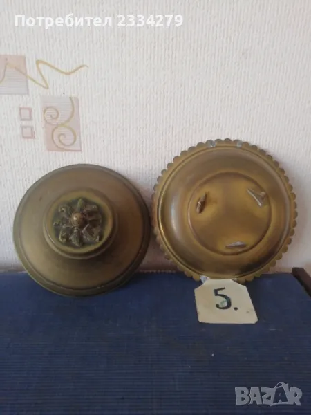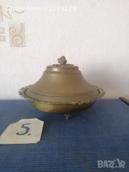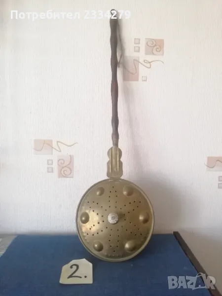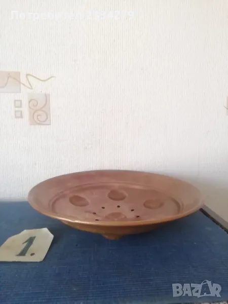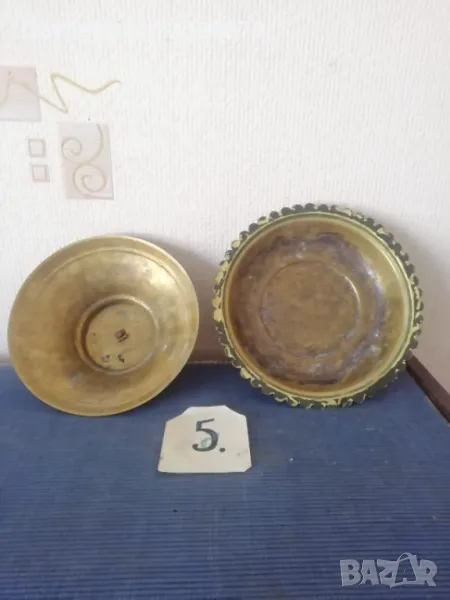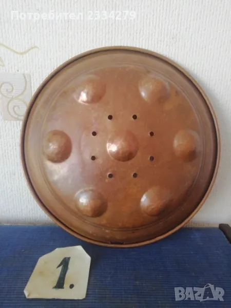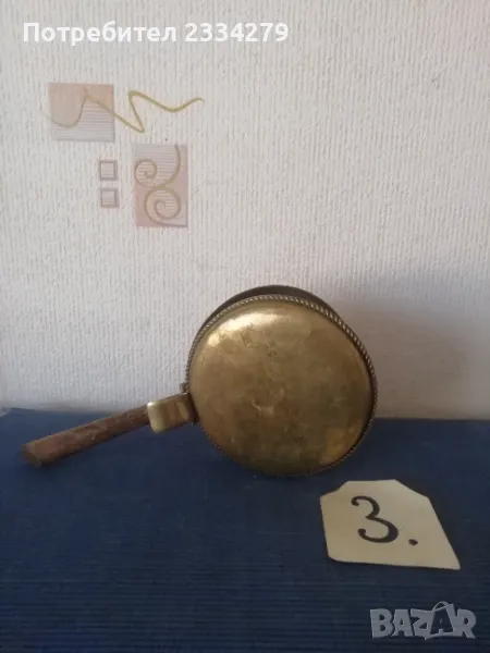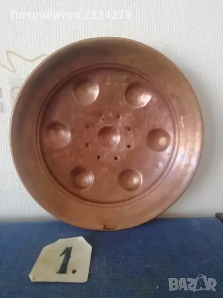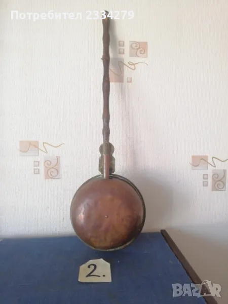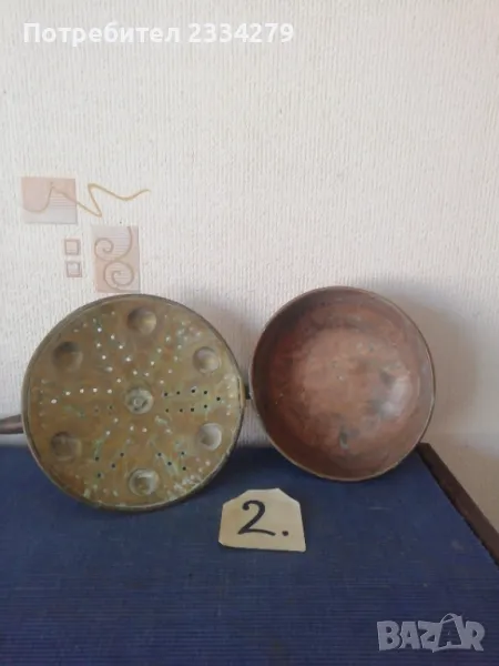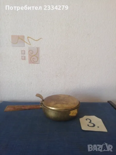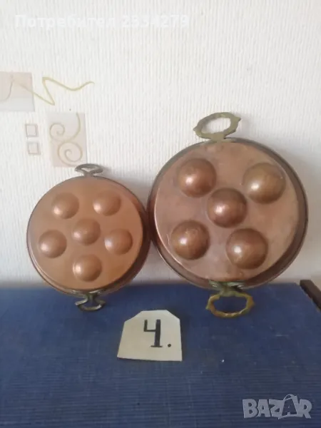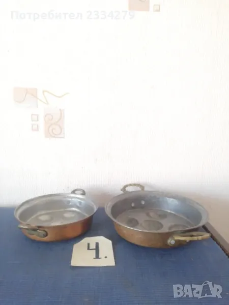 Стари домакински съдове от френска стара кухня и битът. N:1 Меден гевгир-тава сразмери: широчина 30см.,дълбок 6см.,цена 25лв.; N:2 съд меден с дървена дръжка използван и като нагревател за легло, размери: дължина с дръжката 67см.,широчина на пантера 21см., цена 35лв.; N:3 съд за притопляне варене на етерични и козметични масла използвани в банята и домакинството, изработен от бронз в повдигащ капак, размери: дължина 27см.,широчина 15см.,цена 20лв.; N:4 античен френски тиган за охлюви (escar-got pan) може да се ползва за яйца и други цели, меден калайдисани. Друят по-големият,,Art Dela Table" FRANCE, размери: 20х4см.,цена 30лв. Голямата също е изработена от мед, калайдисана отвътре,бронзови дръжки, форма ,,Art Dela Table", размери: , цена 40лв. Изработени в рустикален стил декор и ползване в кухня закачен на стена, изработени 50год. на миналият век; N:5 автентичен бронзов съд купа за сервиране или съхранение храна и сладки, бонбони и други, ръчна изработка с размери: широчина 21см.,височина с капака 17см., цена 25лв. Всички са годни за ползване или за декорация на селска къща, вила, заведение и други в стил ренесанс.