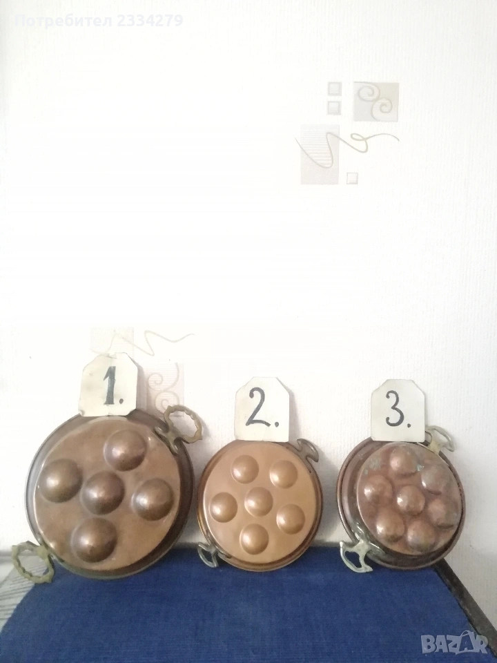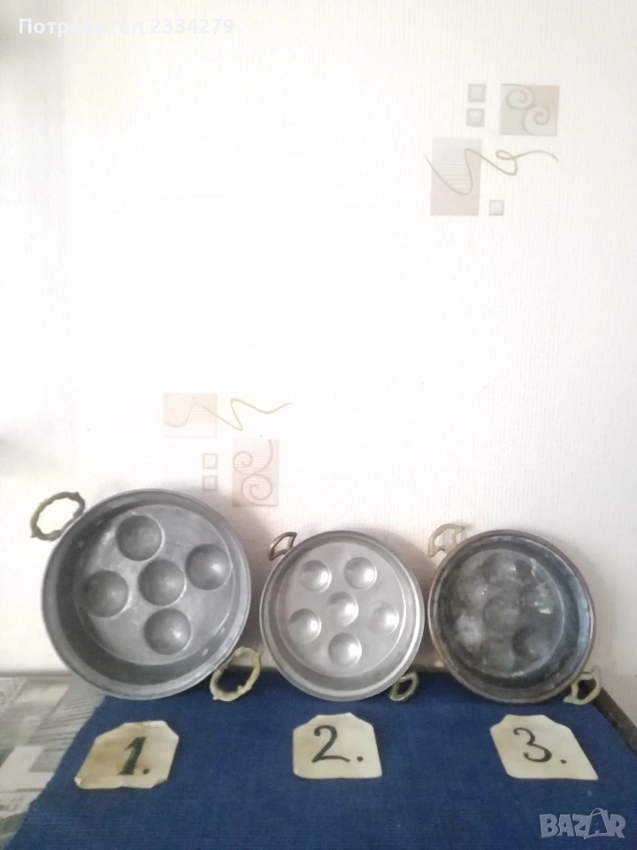 Стари домакински съдове от френска стара кухня и битът. N:1 Меден гевгир-тава сразмери: широчина 30см.,дълбок 6см.,цена 20€.; N:2 съд меден с дървена дръжка използван и като нагревател за легло, размери: дължина с дръжката 67см.,широчина на пантера 21см., цена 20€.; N:3 съд за притопляне варене на етерични и козметични масла използвани в банята и домакинството, изработен от бронз в повдигащ капак, размери: дължина 27см.,широчина 15см.,цена 15€.; N:4 античен френски тиган за охлюви (escar-got pan) може да се ползва за яйца и други цели, меден калайдисани. Друят по-големият,,Art Dela Table" FRANCE, размери: 20х4см.,цена 20€. Голямата също е изработена от мед, калайдисана отвътре,бронзови дръжки, форма ,,Art Dela Table", размери: , цена 27€. Изработени в рустикален стил декор и ползване в кухня закачен на стена, изработени 50год. на миналият век; N:5 автентичен бронзов съд купа за сервиране или съхранение храна и сладки, бонбони и други, ръчна изработка с размери: широчина 21см.,височина с капака 17см., цена 20€. Всички са годни за ползване или за декорация на селска къща, вила, заведение и други в стил ренесанс.