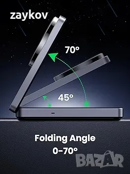 Регулируем ъгъл на гледане: 70° регулируемо и сгъваемо магнитно зарядно устройство ви позволява да използвате вашия iPhone вертикално или хоризонтално, докато се зарежда. Насладете се на гъвкавостта да изпълнявате задачи като гледане на видеоклипове, четене на имейли или чат с приятели без прекъсвания.