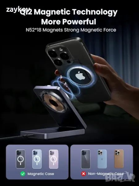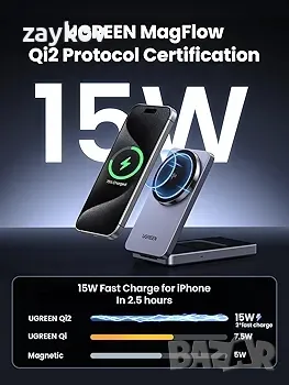 Безжично зарядно устройство UGREEN Qi2 15W MagFlow, 2 в 1 станция за бързо зареждане